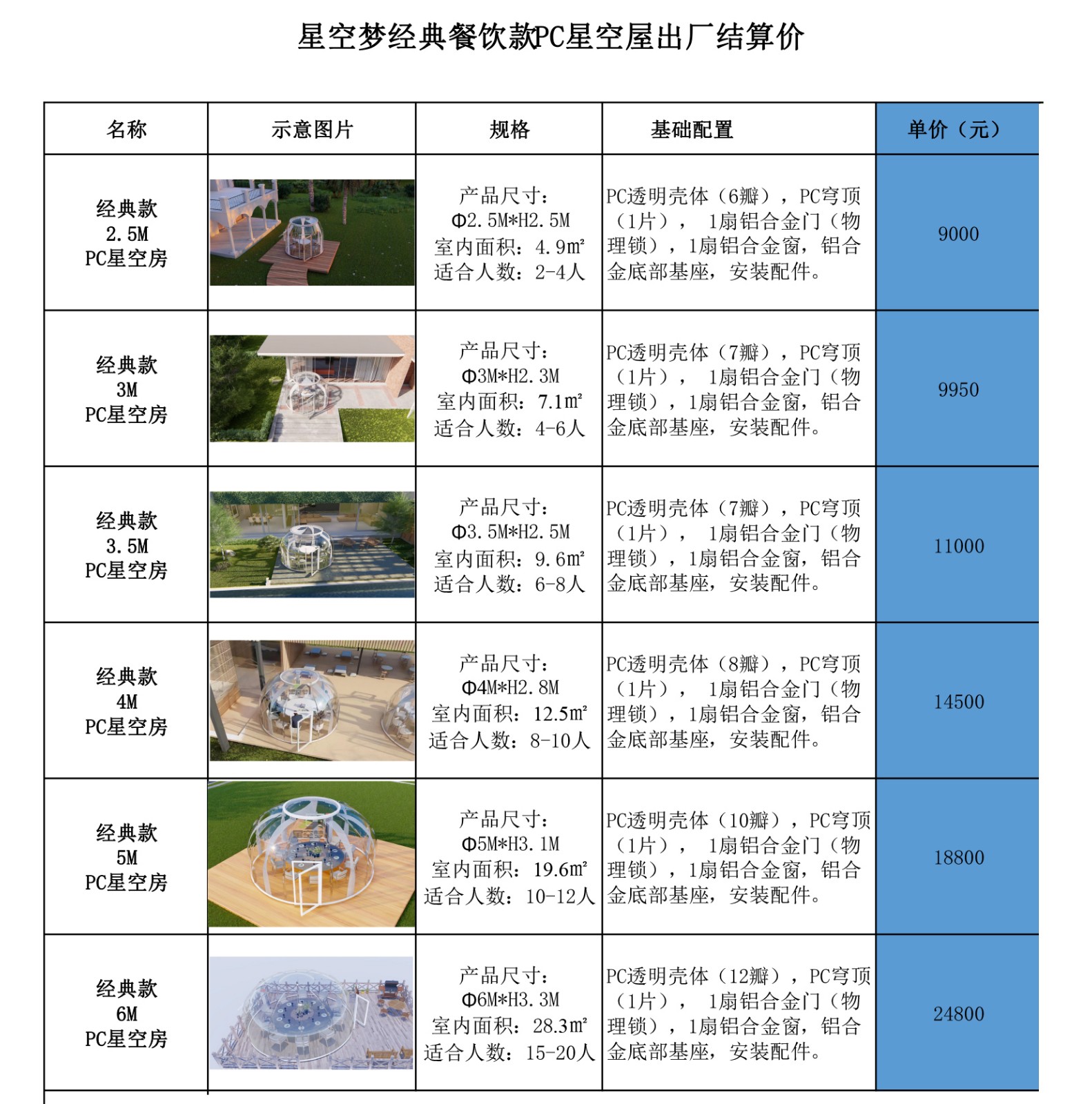 目前,星空梦经典款星空房直径2.5米售价仅为8600元,直径越大价格也越高,以下为“星空梦”经典款星空房的详细报价单,可供大家参考下: